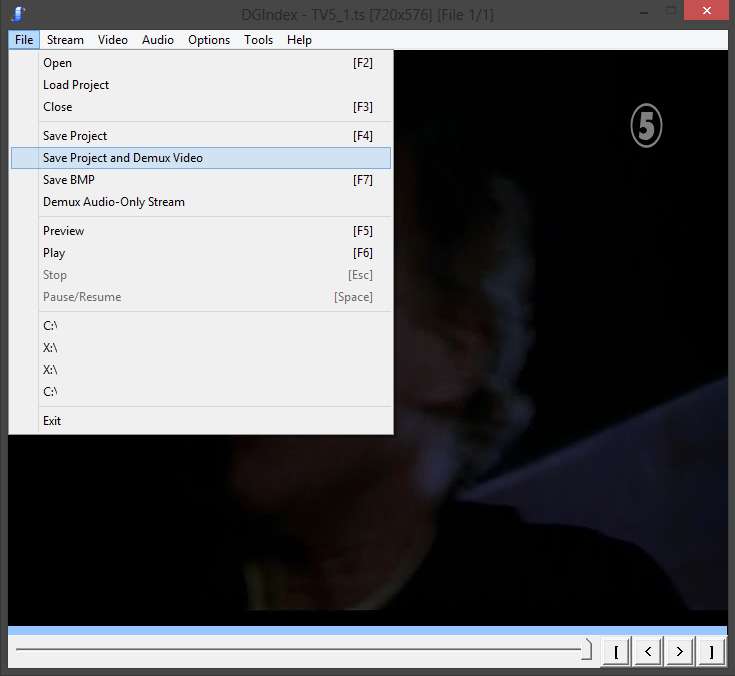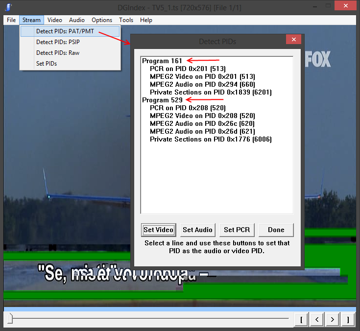 Käynnistä DGIndex -ohjelma ja avaa nauhoitettu video → Stream valikosta valitse Detect PIDs PAT/PMT → Ilmestyy lista jossa näkyy kaksi eri ohjelmaa ja niitten video ja ääni streamit → Valitse oikea video, ääni ja PCR painamalla Set x → Tallenna nyt valitsemalla Save Project and Demux Video, jolloin ohjelma luo sinulle oikeat video ja ääni tiedostot. Tiedostoa nimettäessä ei tarvitse lisätä tiedoston päätettä. Ohjelma vain purkaa valitut osiot ja ei pakkaa uudelleen.