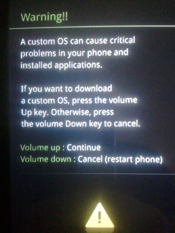 Samsung logon kohdalla voit vapauttaa Virta-napin. Jatka muitten näppäimien pitämistä pohjassa kunnes näet seuraavan ohje valikon. Paina Continue eli Volume Up.