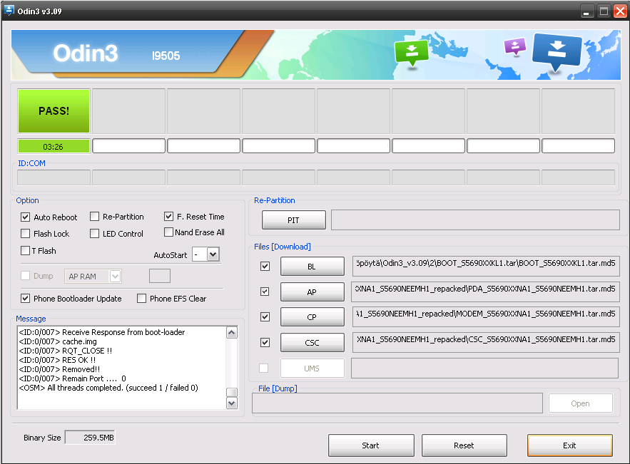 Puhelimen pitäisi nyt ilmestyä Odin3 ohjelmaan satunnaisena COMxx -laitteena. Pura *.zip -tiedostot ja valitse ne kuvan mukaisesti. Muista myäs valita Phone Boot Loader Update. Paina Start ja ohjelma asentaa ohjelmiston puhelimeen, jonka jälkeen puhelin käynnistyy uudelleen. Kunnes on käynnistynyt niin voit irroittaa USB piuhan ja valmista on!