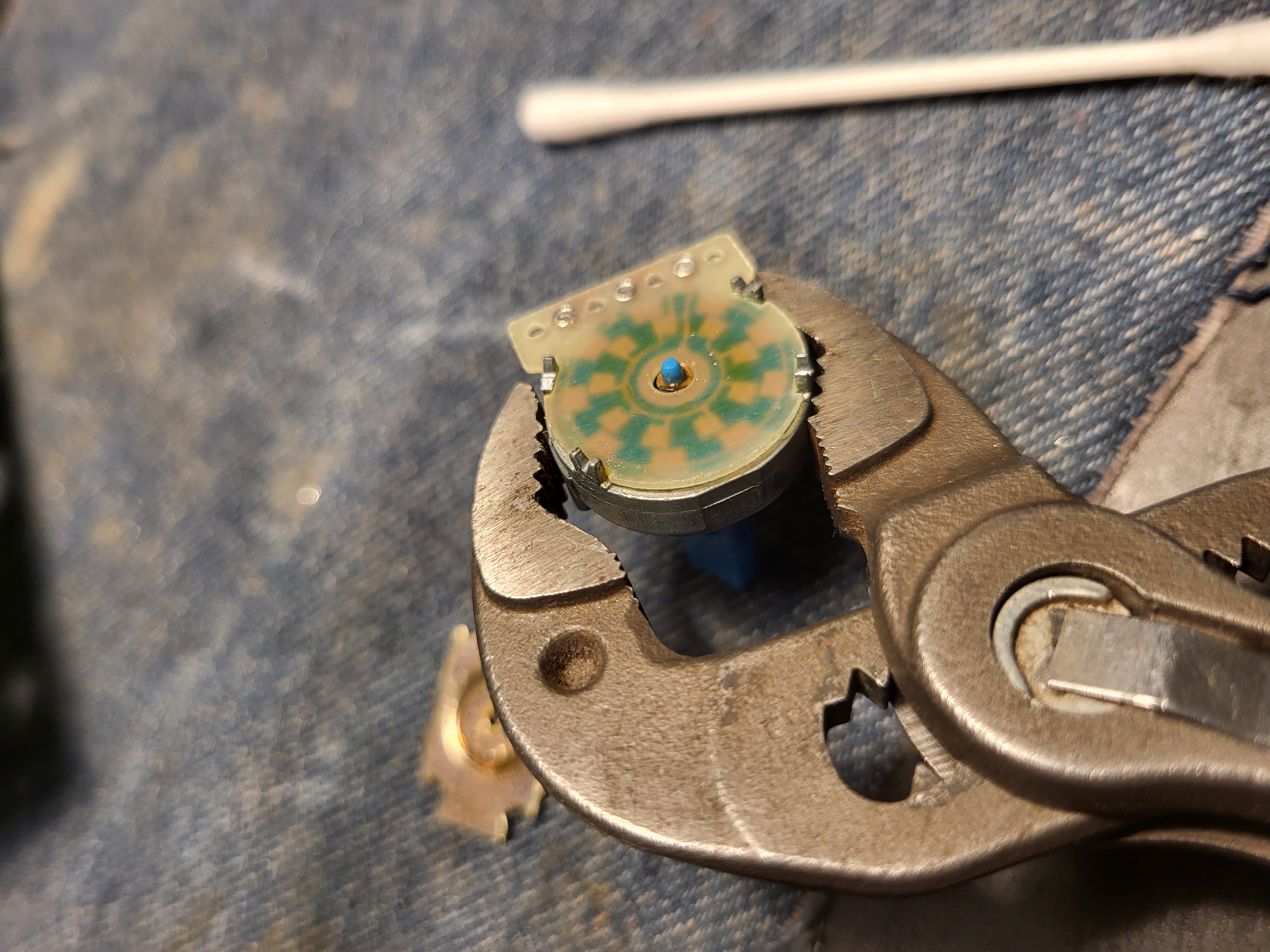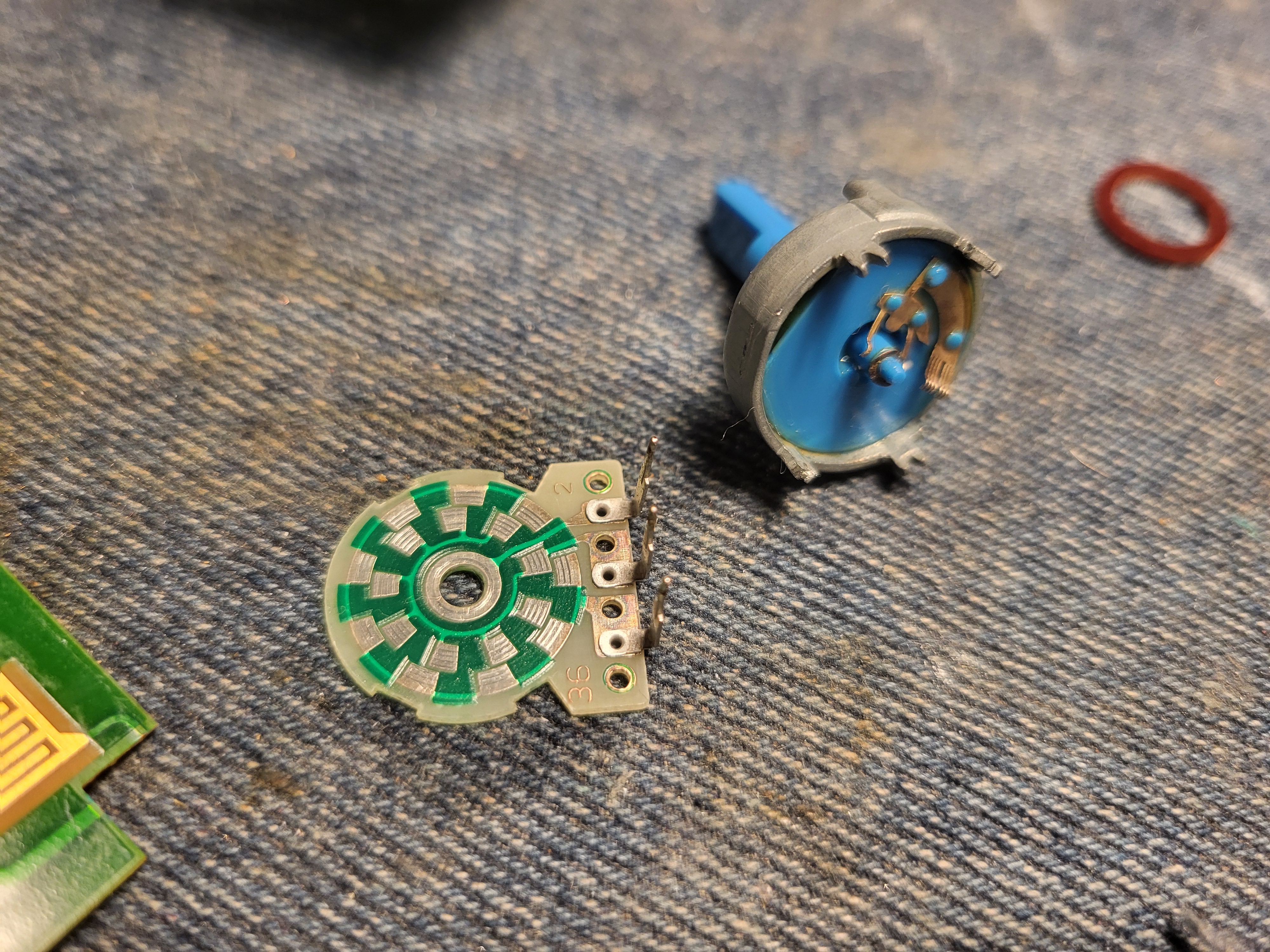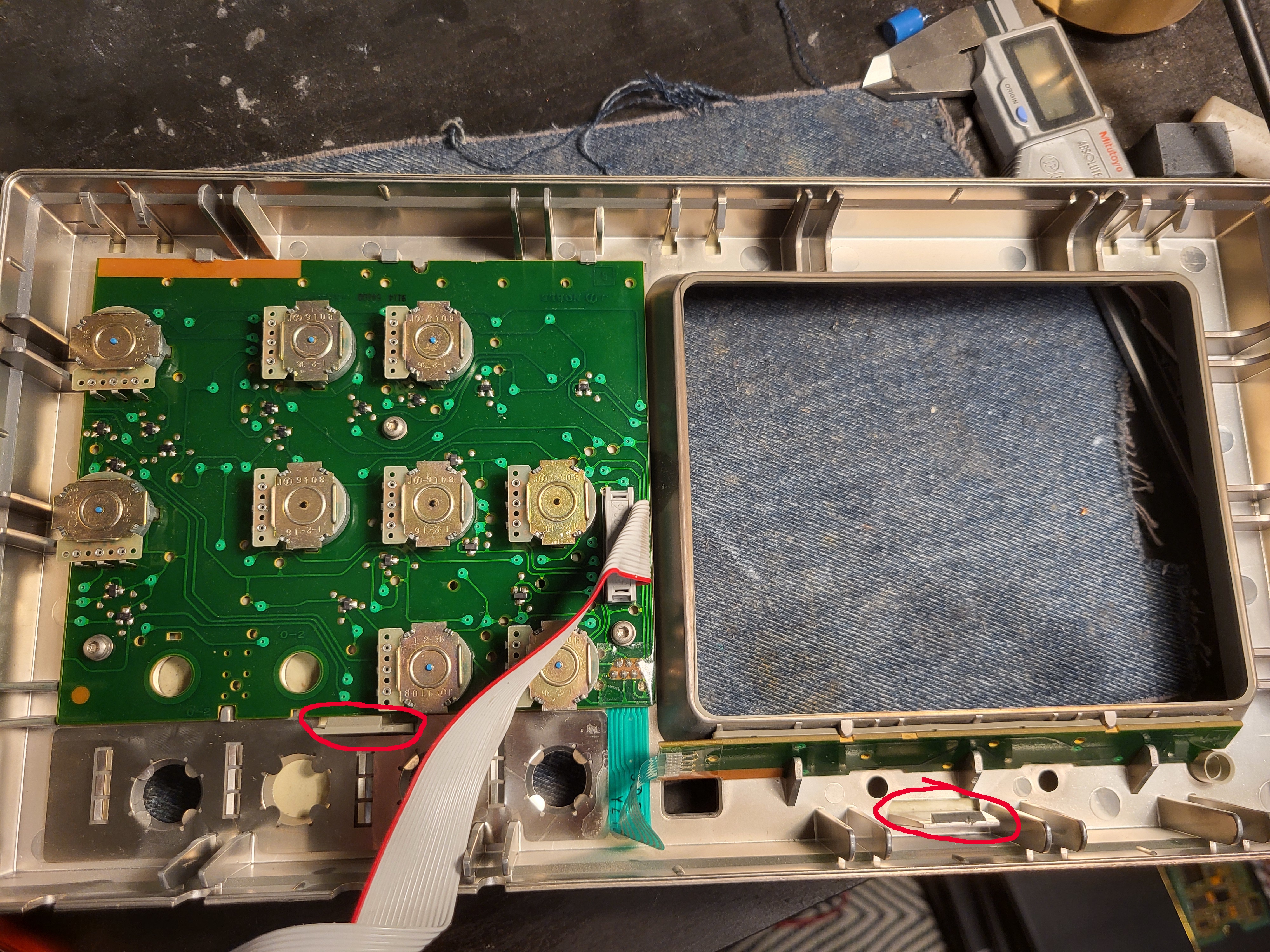 Itse korjaukseen. Enkooderien juottaminen irti, purku ja pumpulipuikoilla ja IPA:lla puhdistus sisältä ja kasaus.. tätä ei voi montaa kertaa tehdä että sen saa takaisin kiinni pysymään. Pohja on kiinnitetty enkooderin rungon pienillä taivutus osiolla joista useimmat hajos mutta vielä pysyivät kiinni.