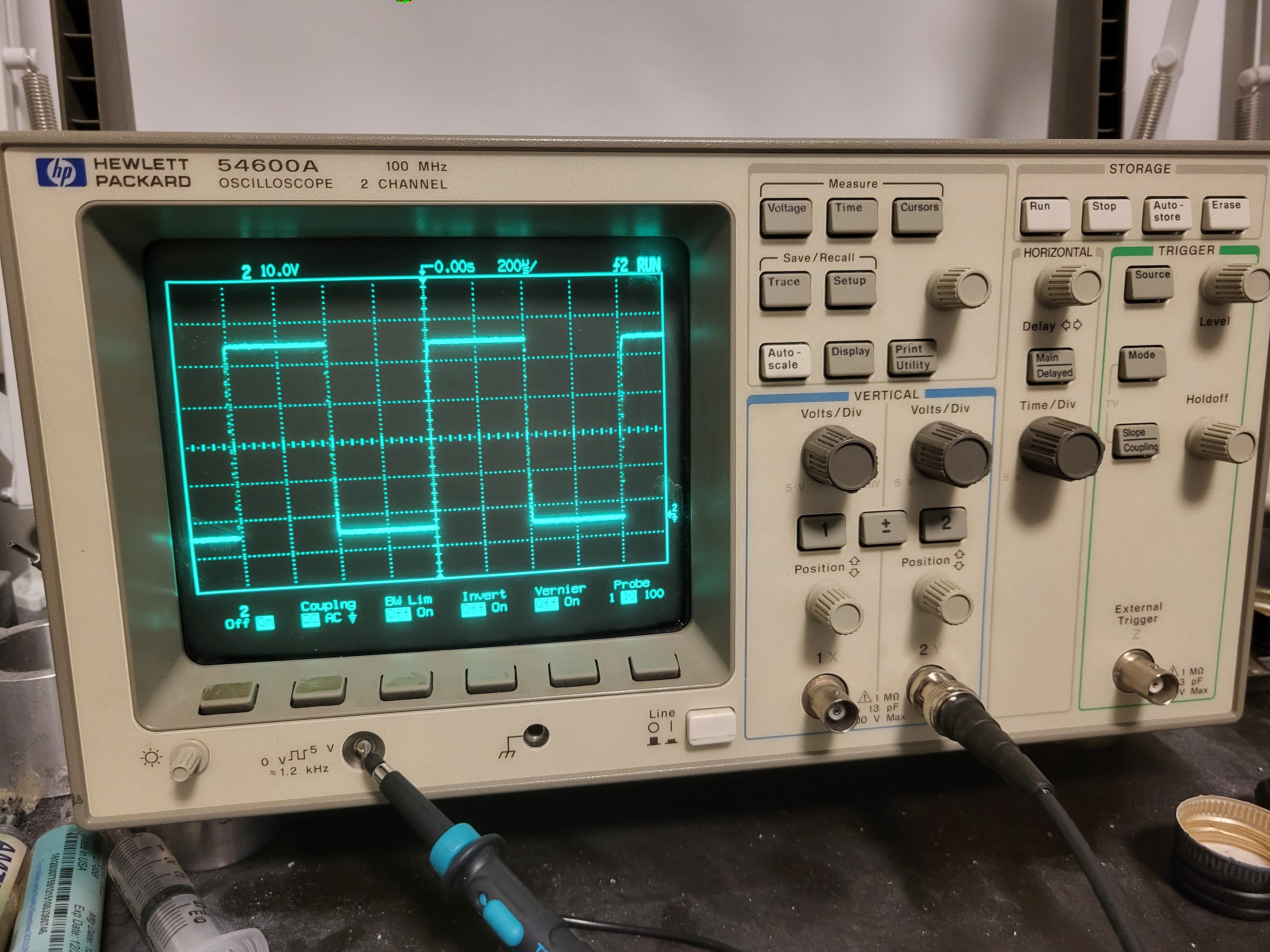 Siirryin USB skoopista fyysiseen oskilloskooppiin kun halusin fyysisiä nappeja hipelöillä ja nähdä nopeampaa vasteaikaa. Kuvaan astuu HP 54600A skooppi joka täytti mielenkiinnon erittän hyvin. Hyvä ja sujuva käyttöliittymä. Nämä mallit useimmat tosin jo varoittelee nykyään ettei enään ajantasainen vehe kun 100MHz ei kerro kaikkea vaan eräs rajoitus on 20MS/s. Tosin teoriassa voi tehdä diode samplerin jolloin voi nähdä osittain nopeampia signaaleja.